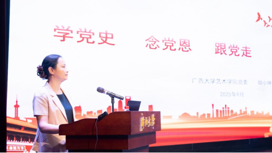 9月19日上午,为帮助2025级新生扣好“思想成长的第一粒扣子”,深化对党的认识、点燃入党热情、树立正确入党动机,艺术学院党委在汇学堂菊隐厅开展2025级新生入党启发教育活动,学院党委书记胡小坤以《学党史 念党恩 跟党走》为题,为全体新生上了一堂生动的理想信念教育课。课堂上,胡小坤结合生动案例,带领同学们系统回顾中国共产党成立百年以来波澜壮阔的奋斗历程,从革命岁月的艰辛探索到新时代的辉煌成就,让同学们深刻感悟党的初心与使命。最后,她勉励同学们端正入党动机,坚定理想信念,积极向党组织靠拢。