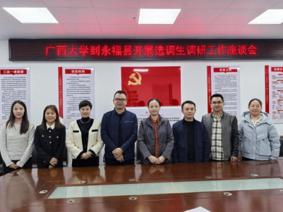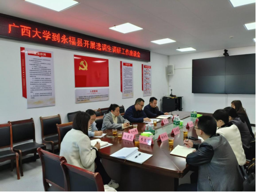 下午,调研座谈会在永福县政府六楼会议室举行。永福县委组织部副部长谢斌主持会议,县文旅局局长蒋俊杰及4名广西大学选调生校友参会,现场交流务实高效、氛围热烈。