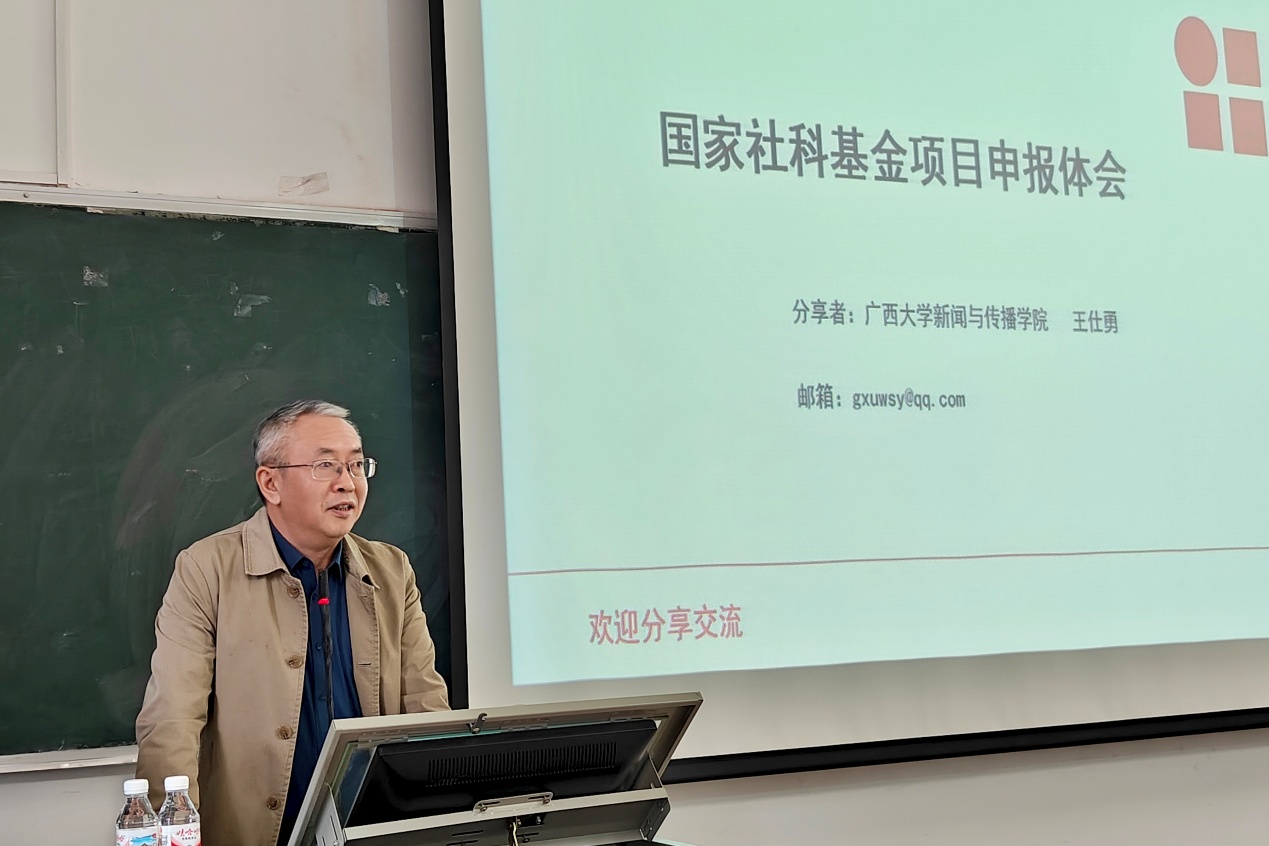 为进一步做好2026年国家社会科学基金项目申报工作,切实提升我院教师科研项目申报能力,1月16日下午,学院举办国家社会科学基金项目申报动员会暨辅导讲座。学院院长胡红一作申报动员讲话,并邀请广西大学新闻与传播学院院长王仕勇教授和我院褚兴彪教授作专题辅导讲座。活动由付宜玲副院长主持,学院多名师生参加。