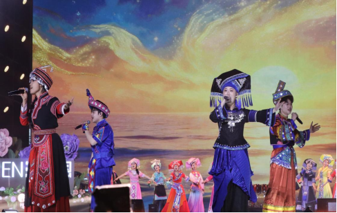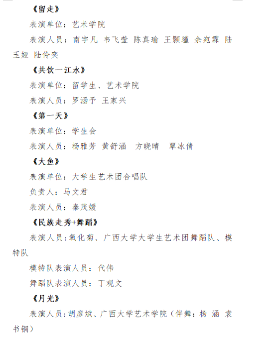 民族歌曲串烧《彩调・铜鸟林》《侗族大歌》《大地飞歌》,既保留了非遗戏曲的韵味与多声部民歌的精髓,又融入现代舞台语汇与青春化表达;《壮乡歌圩》以原生态唱腔展现浓郁广西民族风情与文化底蕴;《留走》以真挚的唱腔诉说心底情愫,声声入耳直抵人心;留学生与本院学生携手演绎的《共饮一江水》,以跨文化的歌声传递同心联结的温暖力量;《壮韵霓裳》民族服饰走秀由艺院学子、校舞蹈队、校模特队与校友氧化菊并肩登台;艺院学子还指导了合唱节目《大鱼》;与胡彦斌、符龙飞、王澳楠等明星艺人同台合作。