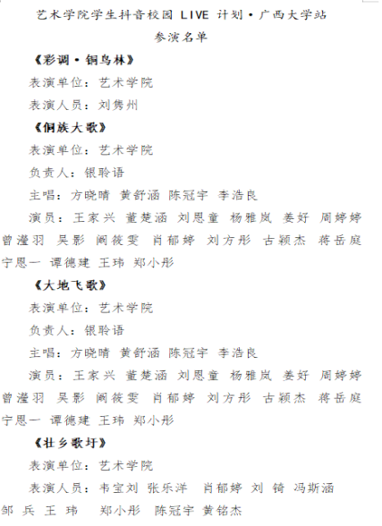 3月22日晚,抖音校园LIVE计划广西大学站演出在学校西校园足球场举行,我院作为主要参演单位共呈现了七个精彩节目。节目涵盖非遗传承、流行演绎、民族展示等多个维度,将专业所学与创新表达相结合,打破传统艺术边界,将广西民族风情与现代舞台表现巧妙融合。