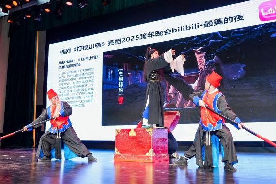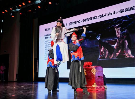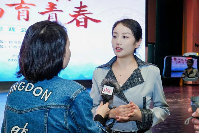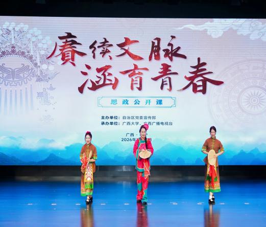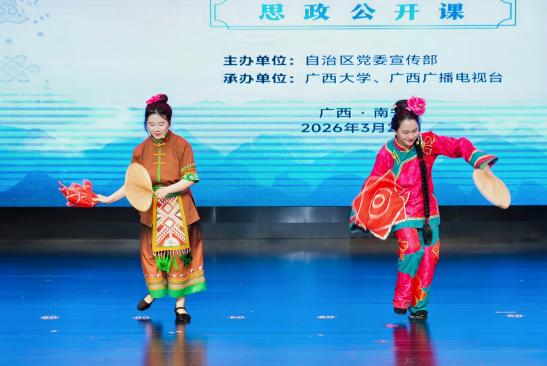 此次公开课由自治区党委宣传部主办,广西大学、广西广播电视台联合承办,创新采用“经典演绎+AI创演实践+思政授课+理论点评”的形式,打破传统授课模式,推动传统艺术与思政教育深度融合。现场,广西大学艺术学院学子演绎广西彩调《刘三姐》选段“戏媒”,广西戏剧院桂剧团呈现经典剧目《打棍出箱》,《黄文秀》剧作视频同步展播,沉浸式表演让师生在视听盛宴中感悟中华文脉底蕴,增强文化自信。